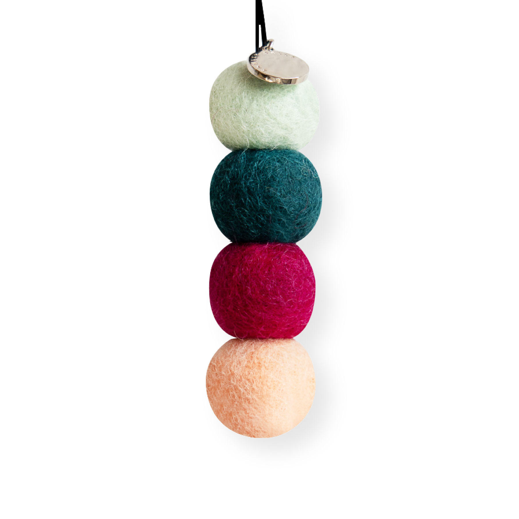 4 Unscented Ethically Sourced Wool Felt Balls with branded charm and elastic string for easy hanging.